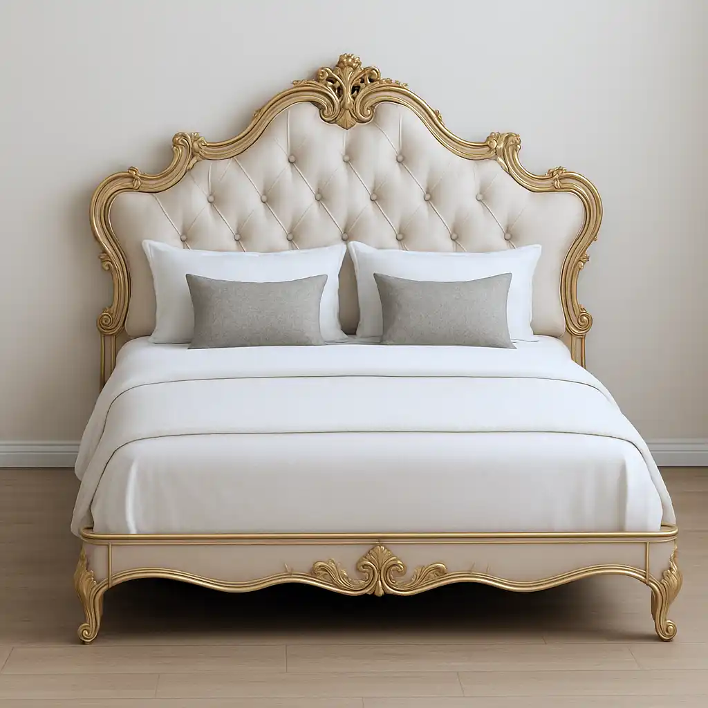 Yatak Başlığı: Barok veya Rokoko tarzı kıvrımlar, derin oyma çerçeve ve taç detayları